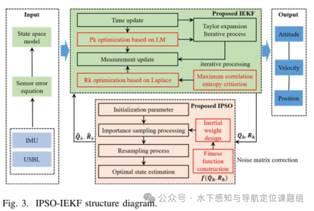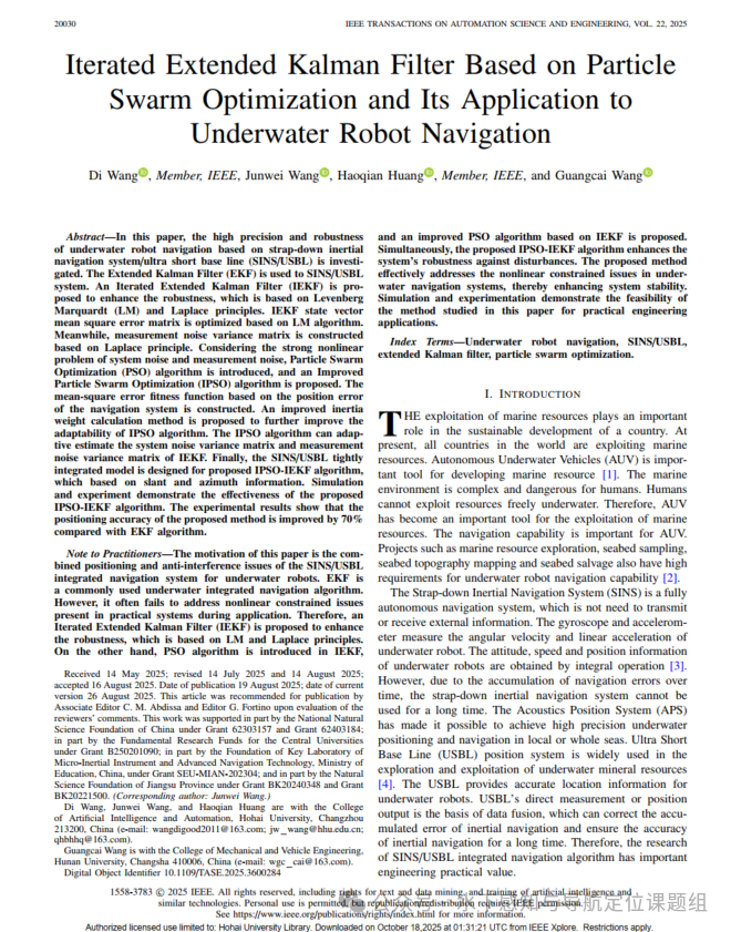 近日,学院先进导航与智能感知课题组王迪副教授的研究论文“Iterated Extended Kalman Filter Based on Particle Swarm Optimization and Its Application to Underwater Robot Navigation”(基于粒子群优化的迭代扩展卡尔曼滤波及其在水下机器人导航中的应用)以长文(Full Paper)形式录用在控制领域顶刊《IEEE Transactions on Automation Science and Engineering》(IEEE TASE)上。该论文提出了一种新颖的水下机器人SINS/USBL组合定位方案用于复杂水下场景。河海大学人工智能与自动化学院王迪副教授为论文的第一作者,王俊玮老师为通信作者。河海大学为论文的第一作者单位,湖南大学为合作单位,该研究得到了国家自然科学基金等项目的资助。论文研究了基于惯性导航系统/超短基线(SINS/USBL)的水下机器人导航的高精度与鲁棒性问题。基于Levenberg Marquardt与拉普拉斯原理提出迭代扩展卡尔曼滤波器(IEKF)以增强鲁棒性。针对系统噪声与测量噪声的强非线性问题,提出改进型粒子群优化(IPSO)算法。构建基于导航系统位置误差的均方误差适应度函数,提出改进型惯性权重计算方法以进一步提升IPSO算法适应性。最终基于斜距与方位信息,为所提IPSO-IEKF算法设计了SINS/USBL紧耦合模型。仿真与实验验证了所提算法的有效性。