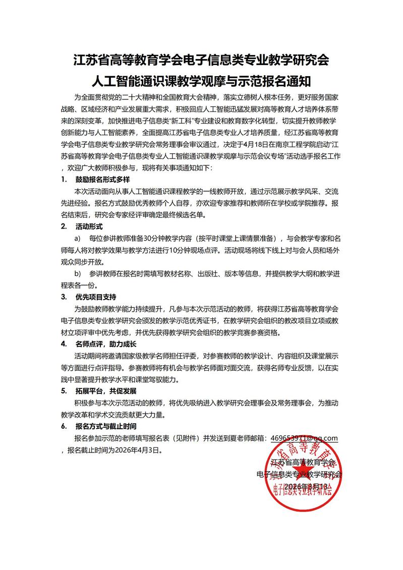 江苏省高等教育学会电子信息类专业教学研究会人工智能通识课教学观摩与示范报名通知